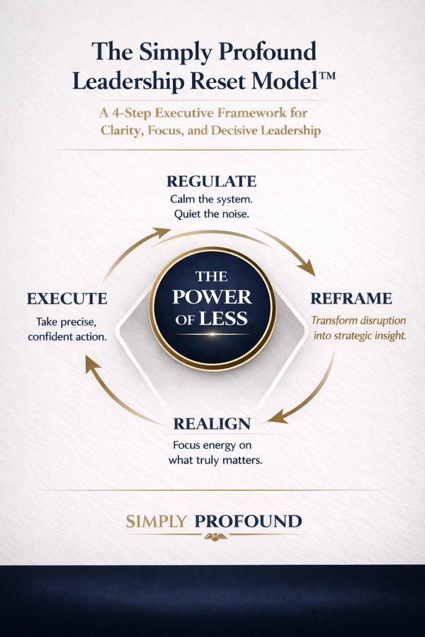 A small group of 15 leaders gathering for a focused 60-minute strategic reset using the Simply Profound Leadership Reset Model™ to quiet mental noise, reframe disruption, and regain clarity for high-stakes decisions.
